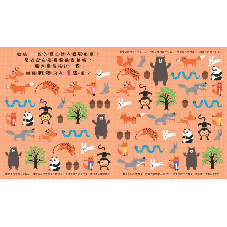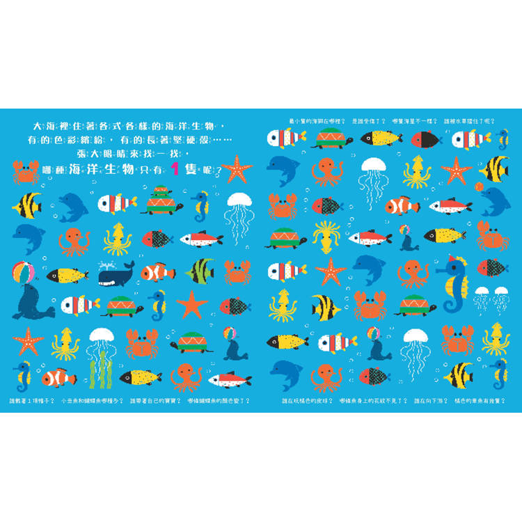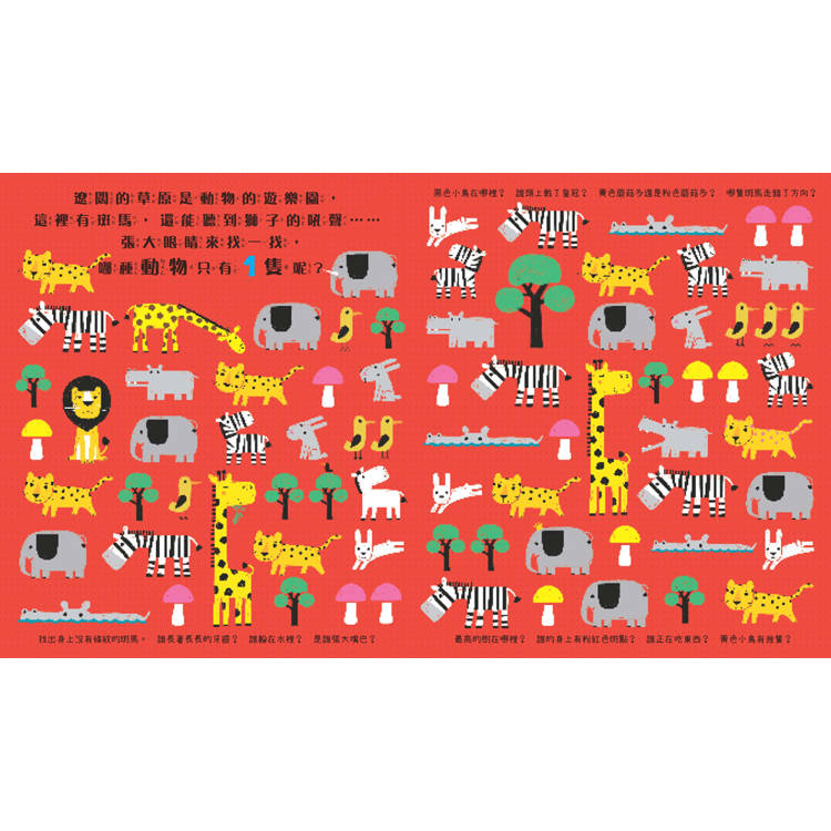 本書共有12個有趣主題,156個好玩互動遊戲,帶領孩子想一想、找一找,看看哪種動物或物品「跟其他不一樣」?不僅訓練觀察力、培養專注力,更能提高邏輯思維能力,學習數字、形狀、顏色等基礎認知。
