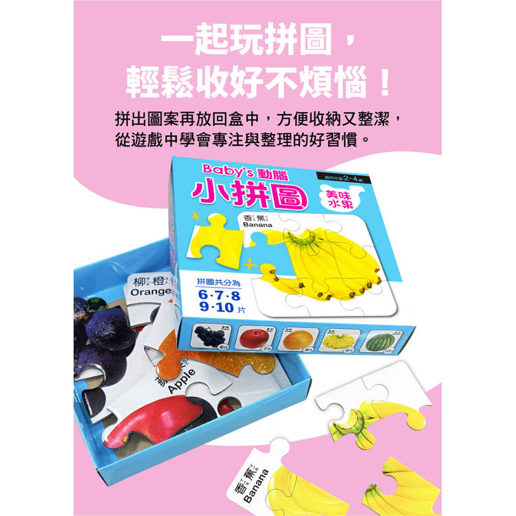 專為2~4歲幼兒設計的啟發益智遊戲。從6片到10片循序漸進,讓孩子在拼湊過程中觀察、思考、動手完成圖像,訓練專注力與手眼協調,並從中建立信心與成就感。真實色彩圖片搭配中英對照單字,學習自然融入遊戲中,是陪伴孩子快樂成長的最佳啟蒙教材!