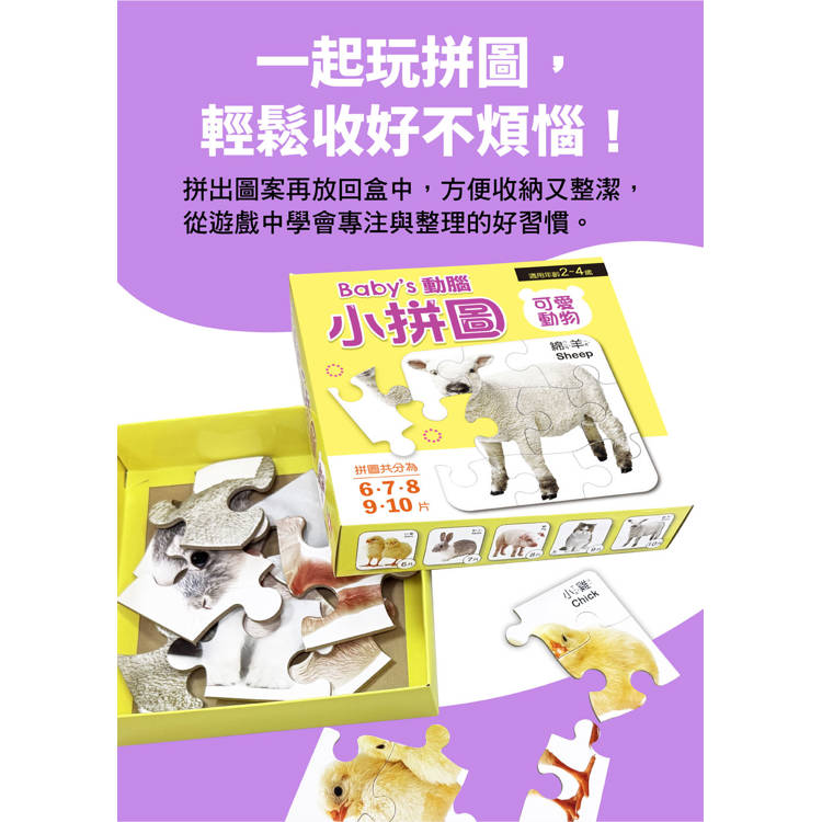 專為2~4歲幼兒設計的啟發益智遊戲。從6片到10片循序漸進,讓孩子在拼湊過程中觀察、思考、動手完成圖像,訓練專注力與手眼協調,並從中建立信心與成就感。真實色彩圖片搭配中英對照單字,學習自然融入遊戲中,是陪伴孩子快樂成長的最佳啟蒙教材!