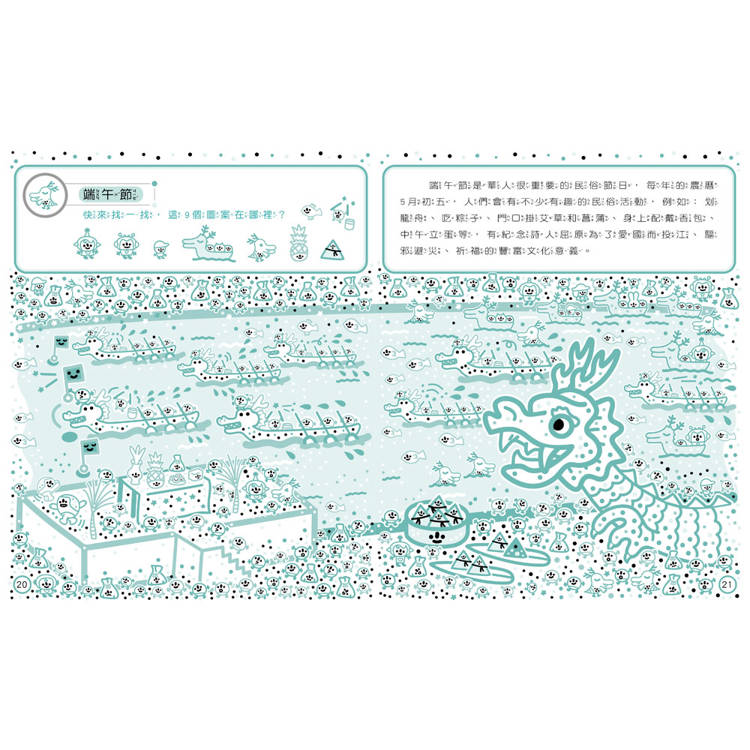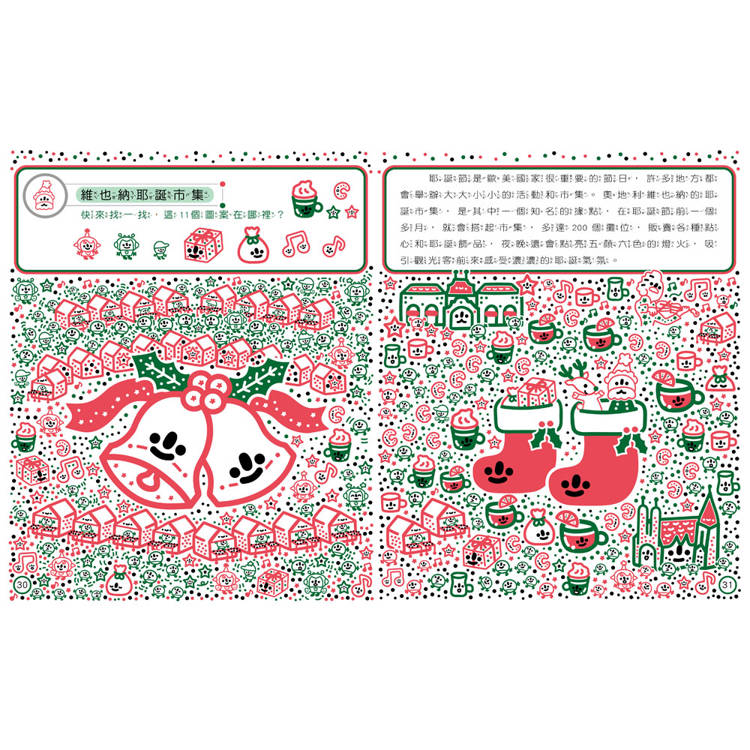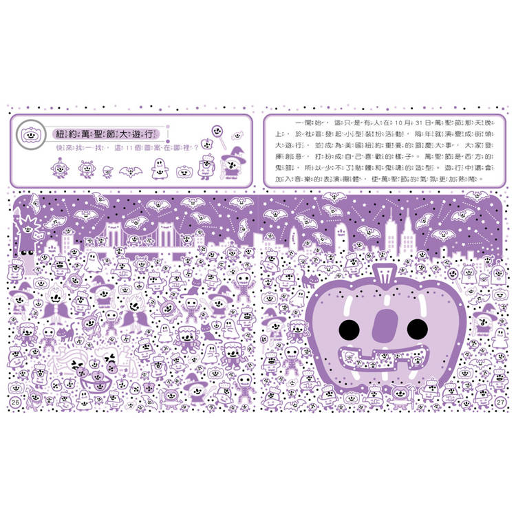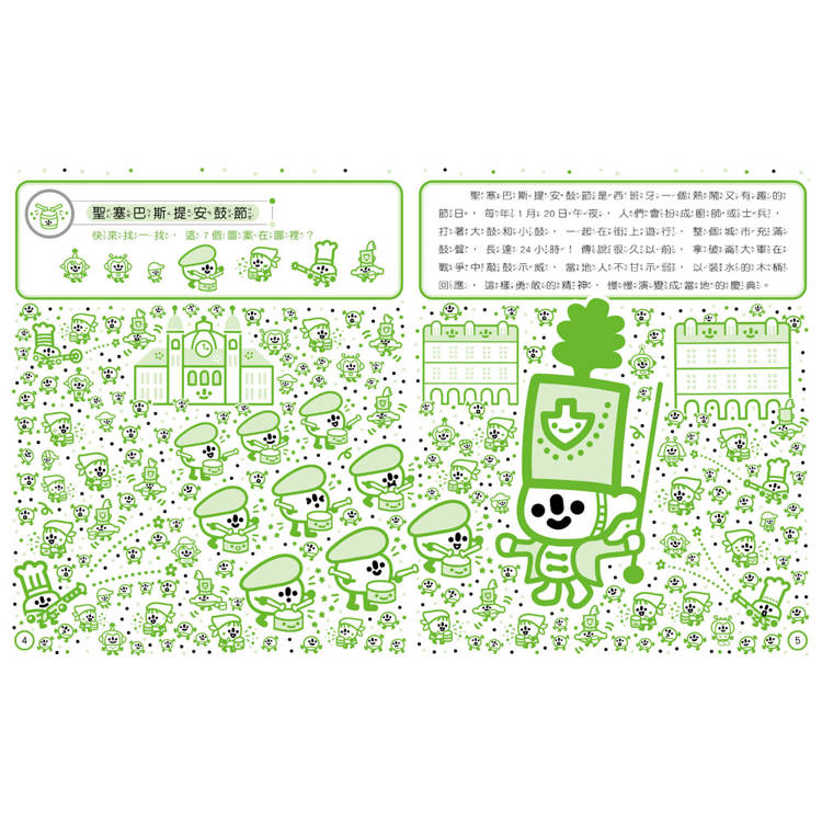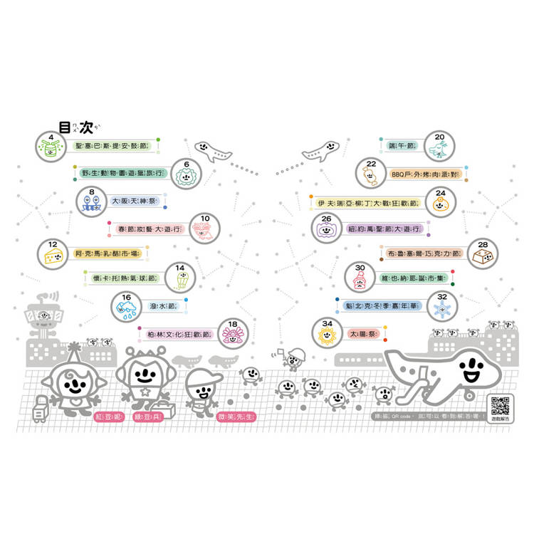 透過主題式單元,認識世界節慶與特色活動的尋寶遊戲書。在可愛的圖案中,找出紅豆妮、綠豆兵、微笑先生與主題指定物件。