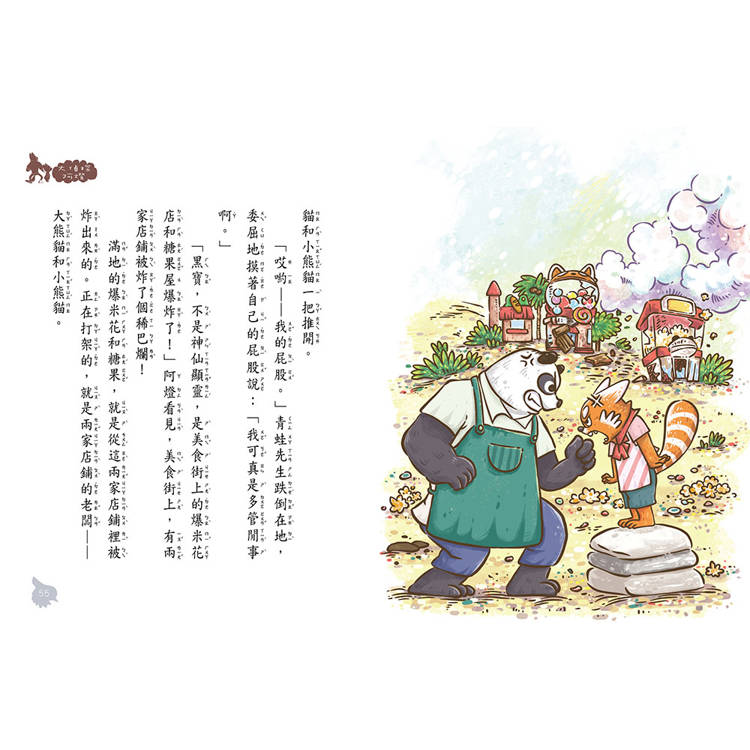 「別聽他胡說!我可沒炸你的店!阿燈先生,我的糖果機裡全是爆米花,明明是大熊貓炸了我的店!」小熊貓雙手插腰,同樣憤怒。