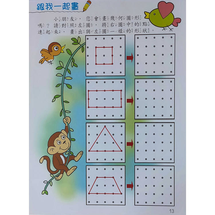 《圖形認知》以趣味圖案與遊戲活動,引導孩子認識形狀、大小、顏色與空間關係,在觀察與操作中建立邏輯概念與美感基礎。