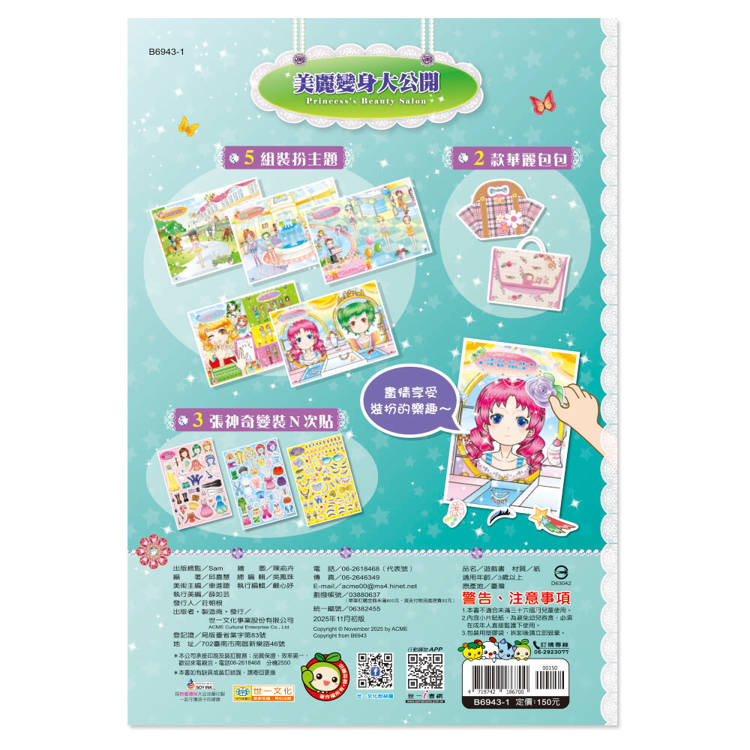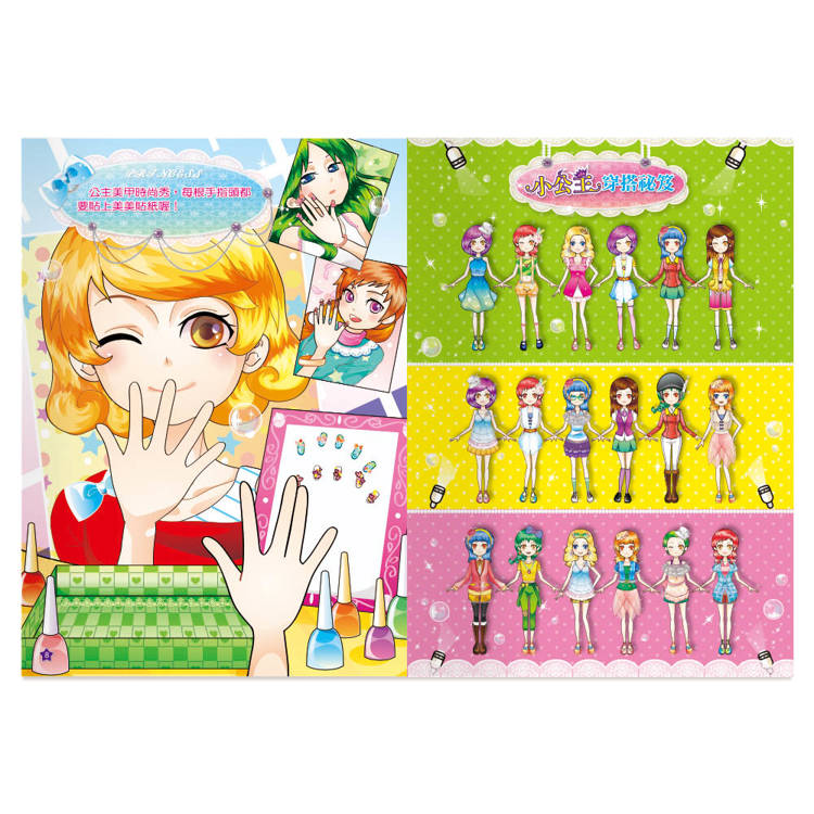 本商品滿足了小女孩愛打扮的心願,可重複黏貼的靜電貼紙,安全又好撕;可愛的立體皮包讓小女孩也能擁有自己的包包,裝著自己最愛的小物;內容還特別設計了臉部化妝、指甲彩繪的頁面,多元的內容,激發出更多的創意組合。通過安全商品檢驗的品質,讓幼兒能玩得更安心。