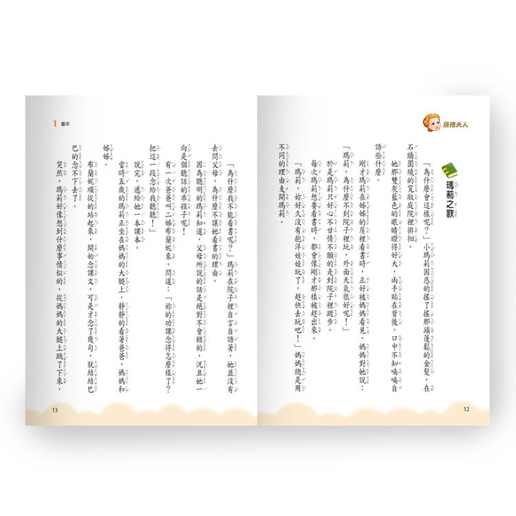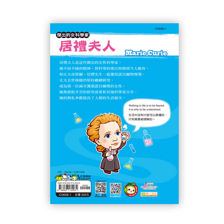 居禮夫人是近代傑出的女性科學家,她對科學的專注與熱情令人佩服,她無私、偉大的人格更是人們的榜樣。本書詳細介紹這位不平凡的女性一生成長、奮鬥的心路歷程,並附有”名詞注解”,方便讀者了解內容,並增加對當時地理、歷史、人文背景的認識。