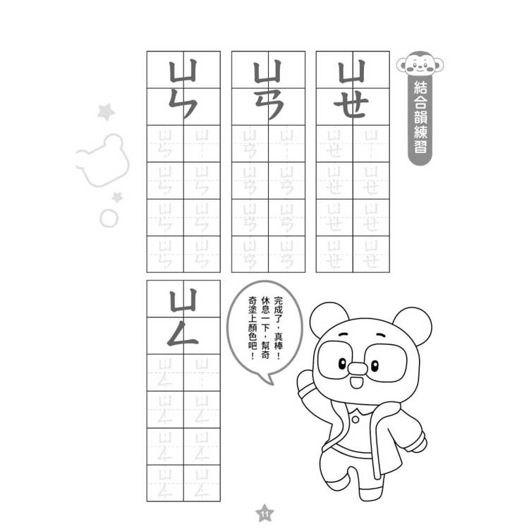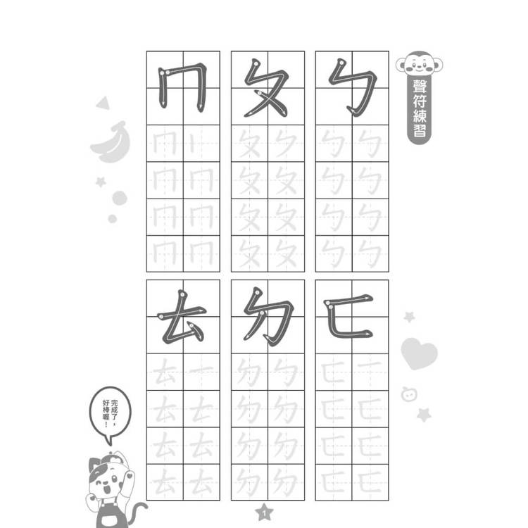 內容依聲符、韻符、介符循序安排,孩子在練習書寫的同時,也逐漸熟悉拼音。