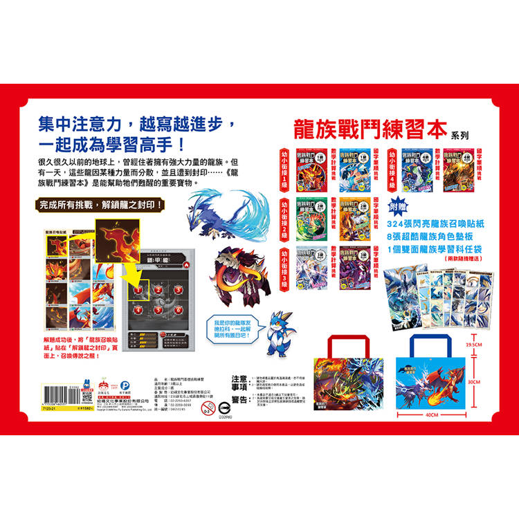 1.《龍族戰鬥練習本》:1~4級國字筆順挑戰與1~4級數學計算挑戰,共八冊。