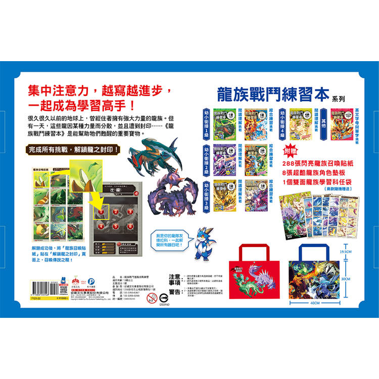 1. 《龍族戰鬥練習本》:1~4級閱讀理解挑戰、1~3級綜合練習挑戰、英文單字與字母挑戰,共八冊。