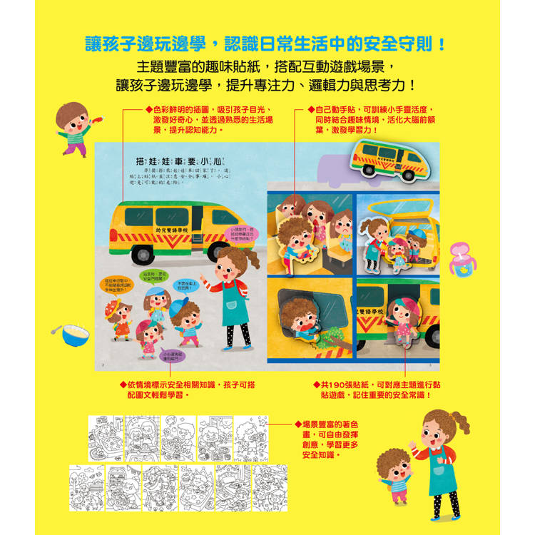 以孩子最熟悉的日常生活為主題,透過情境插圖+互動貼紙,在遊戲中認識基本的安全規則與自我保護觀念。不是被要求「背規則」,而是先觀察畫面 → 思考狀況 → 動手貼貼紙,在操作與討論中,自然建立正確的安全行為。讓安全教育不再是說教,而是生活的一部分。