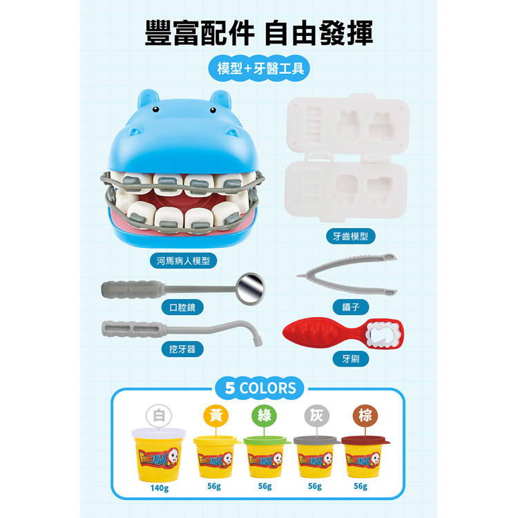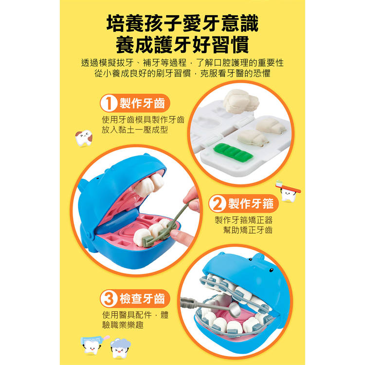 柔軟安全的小麥黏土搭配多樣牙醫配件,鼓勵孩子自由創作與情境想像,在捏塑、按壓與造型的過程中訓練手部精細動作與手眼協調能力,同時提升專注力與創造力。透過親子共玩與角色互動,讓學習不再只是說教,而是在歡樂遊戲中自然養成愛護牙齒的好習慣。