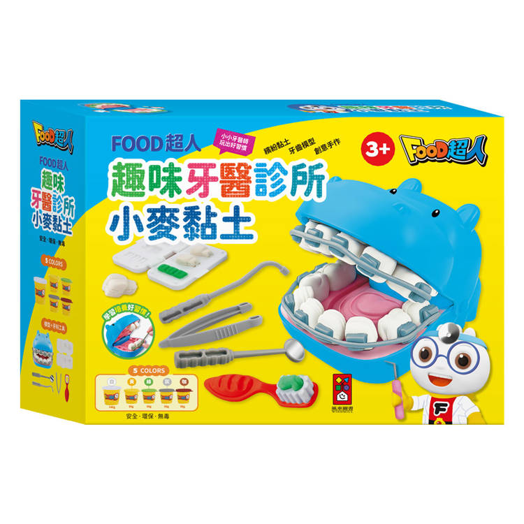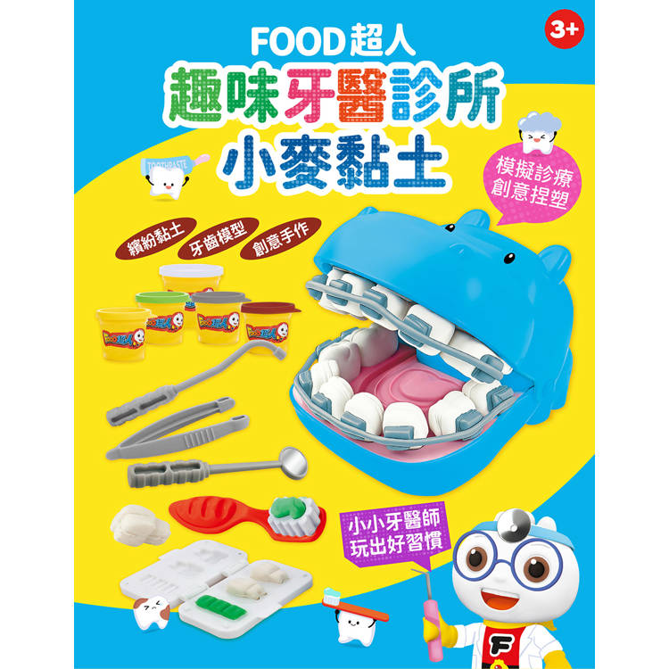《FOOD超人 趣味牙醫診所小麥黏土》結合角色扮演與黏土創作遊戲,讓孩子透過操作牙醫工具、製作牙齒模型與模擬看診情境,在遊戲中認識牙齒構造與口腔清潔的重要性。孩子可以替牙齒檢查、清潔與修復,邊玩邊建立良好的生活習慣與健康觀念。