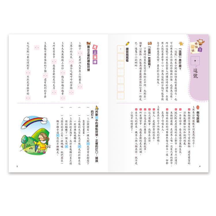 本書收錄(重訂標點符號手冊修訂版)之十五種標點符號,第一部分解說包含名稱,符號,位置,說明,用法舉例等五項,第二部分應用文章讓學生練習(如何用),從中學習如何正確標注符號使語意表達完整,進而培養想像力,思維力,記憶力,感受力.等語文基本能力.