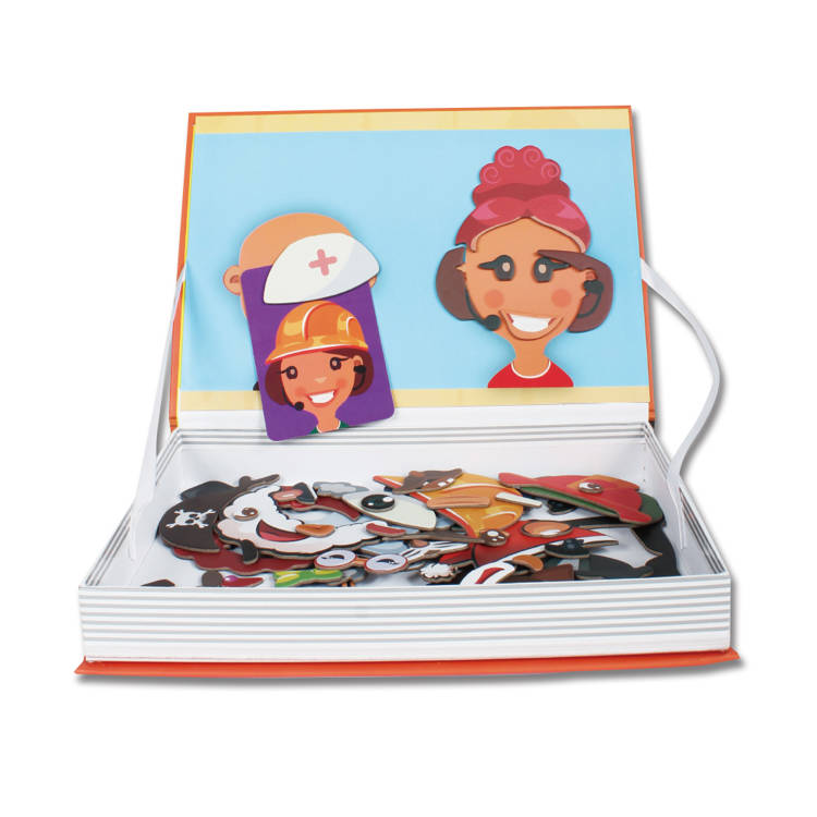 藉由五官、配件的磁片,引導小朋友先依照示範卡在盒蓋的臉型上進行拼組,並認識五官、配件的名稱,建立培養整體與部分的概念。接著發揮想像、創造力,拼組出特別的裝扮。