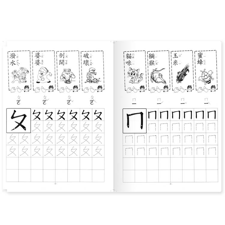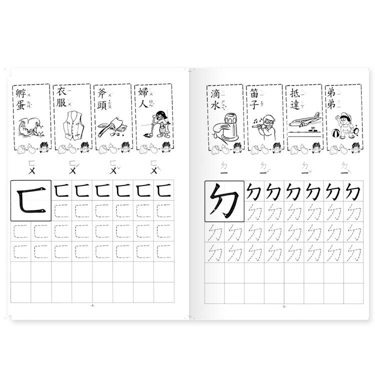 本書含37個注音符號的筆順及練習,提供充分練習次數,使孩子熟悉注音符號,且有4個注音相關的詞語搭配,加深孩子的印象並擴充詞彙量。