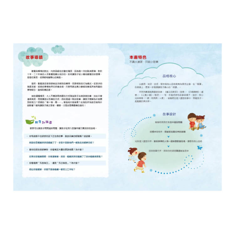 繪本透過貼近生活、幽默有趣的故事,以潛移默化的方式培養孩子良好的品格。內容有親子互動的引導,不僅能提升閱讀興趣,也幫助孩子建立正向的人生觀。
