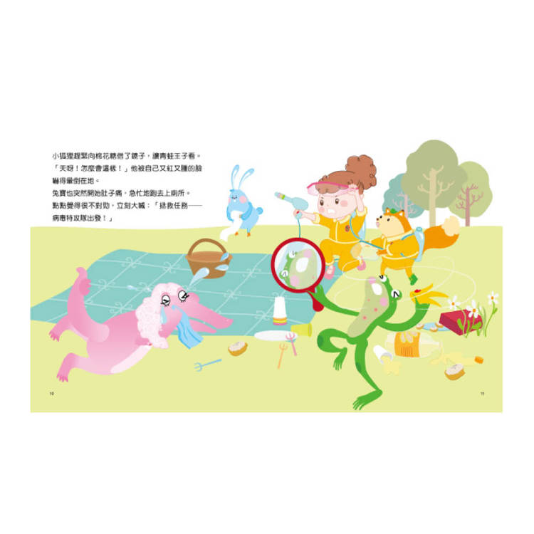 以五個生動的主角,藉由趣味故事發展,讓小朋友明瞭腸病毒感染來源、發病過程、典型症狀、治療過程以及如何預防和如何避免傳染給其他人。讓我們一起學習保護自己與家人的方法,不再因一知半解而充滿恐懼。相信與小朋友共讀這本書時,藉由分享互動模式,彼此都能更了解腸病毒的知識。