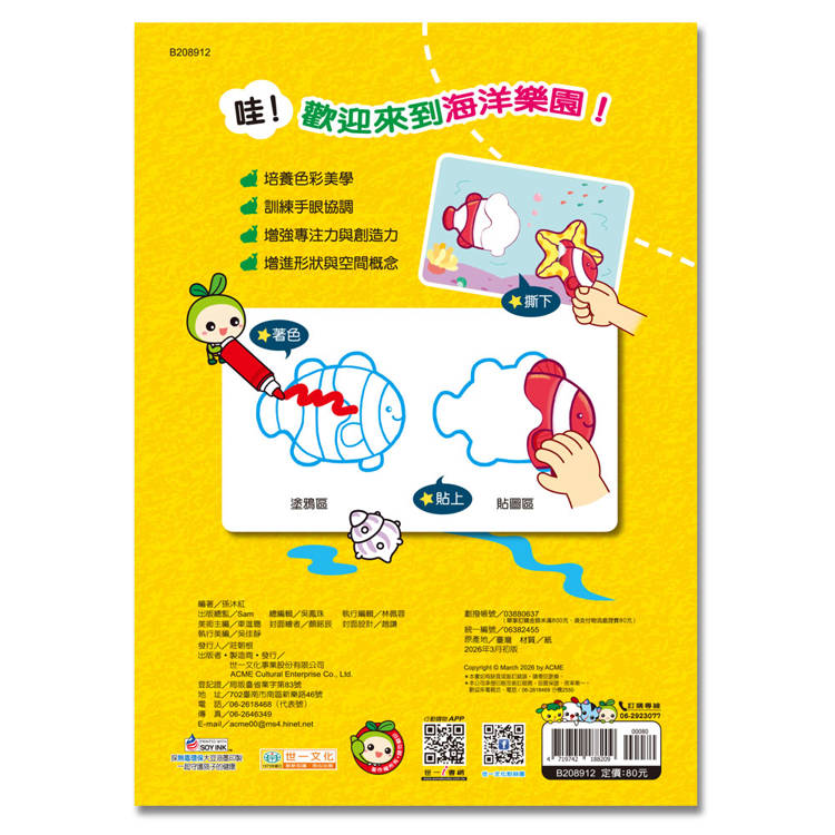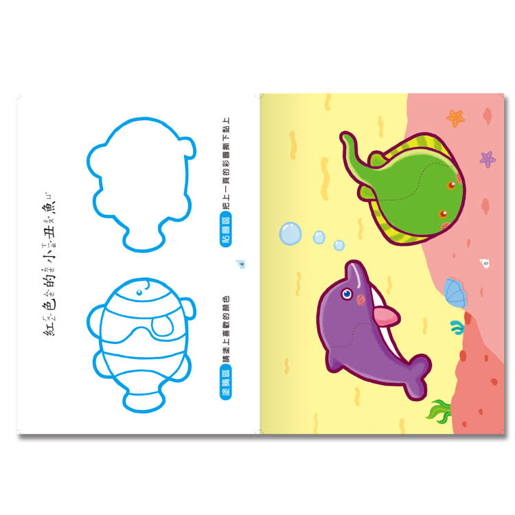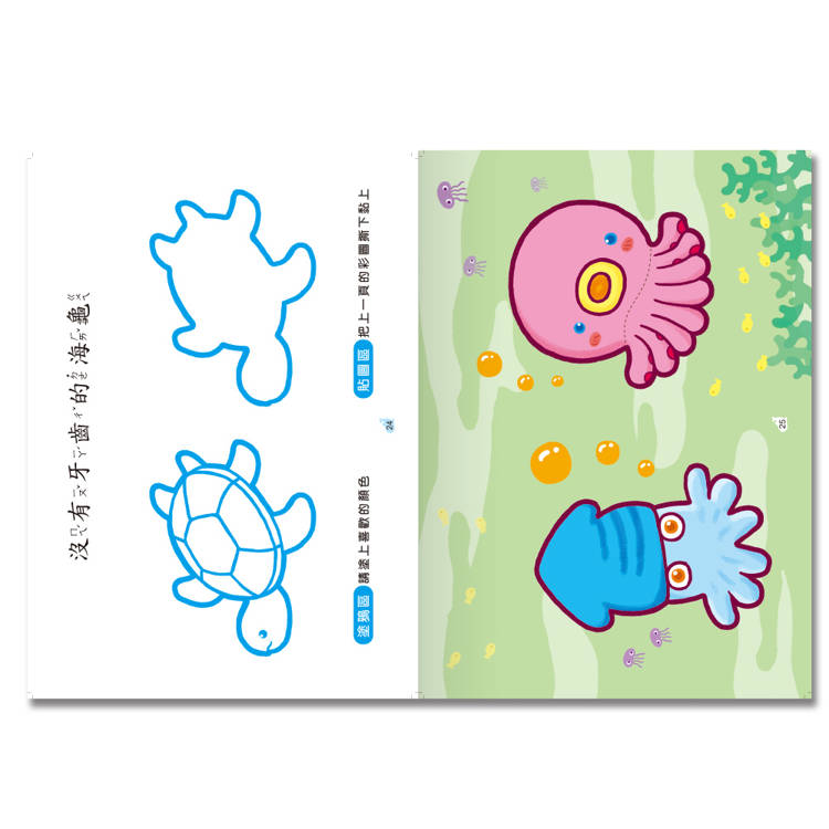共有16種海洋生物圖案,孩子可將書本中的圖案撕下,粘貼至黏貼處,並在海洋生物的輪廓上自由塗色,發揮創意。本書希望透過撕、貼、畫的過程讓孩子辨別不同的海洋生物、培養孩子色彩美感素養、訓練孩子的手眼協調感、增進孩子的專注力與創造力、增強孩子的圖案與空間判別能力,是一本專為3歲以上兒童打造的遊戲書。