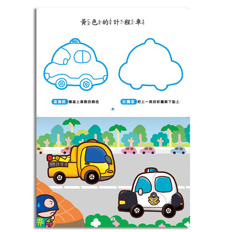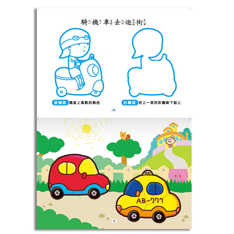 本書共介紹16種常見的交通工具,每篇皆附上一句與交通工具相關的句子,孩子可藉由著色及撕貼遊戲,練習小肌肉的控制,並增進手眼協調能力。是一本認識交通工具的趣味幼兒遊戲書。