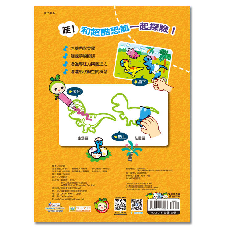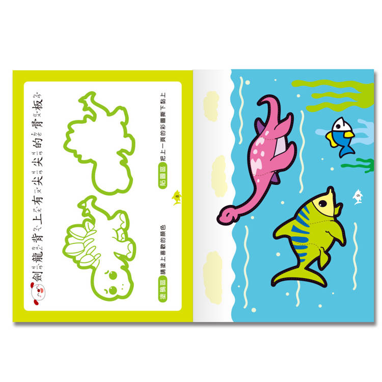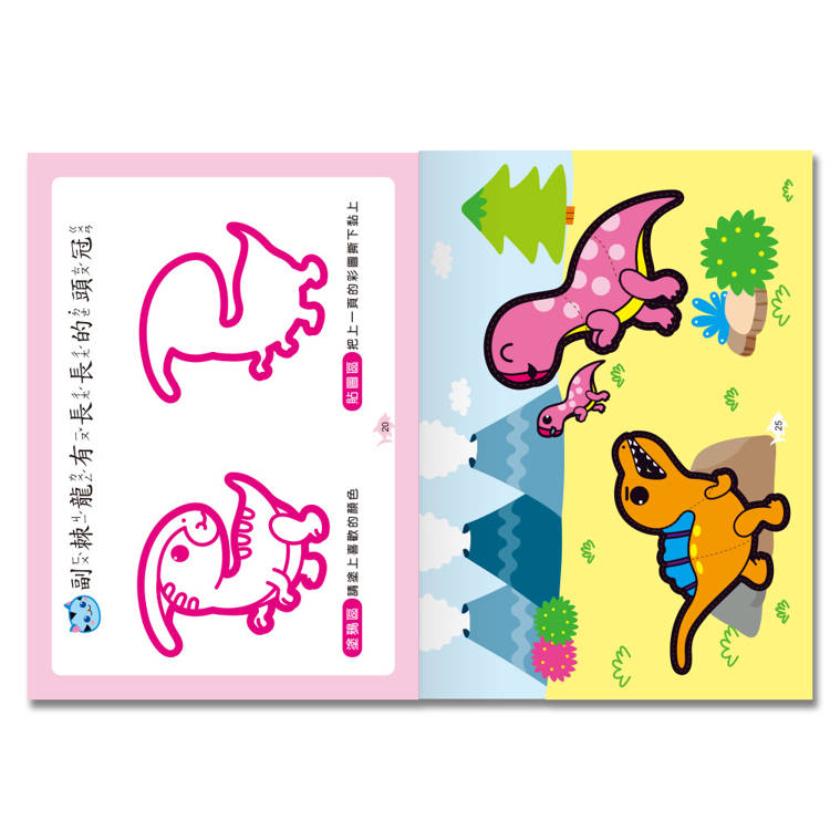 本書共介紹16種常聽見的恐龍,每篇皆附上一句與恐龍相關的句子。孩子可藉由著色及撕貼遊戲,練習小肌肉的控制,並增進手眼協調能力。是一本認識恐龍的趣味幼兒遊戲書。
