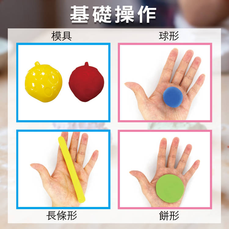 從基礎的球形、長條訓練,到進階的水果壓模造型,引導孩子從平面到立體、從色彩到形狀,全方位探索創作樂趣。透過揉、捏、壓、塑的指尖運動,不只訓練精細動作,更能釋放無限想像力,是爸媽最放心的居家陪玩神隊友!