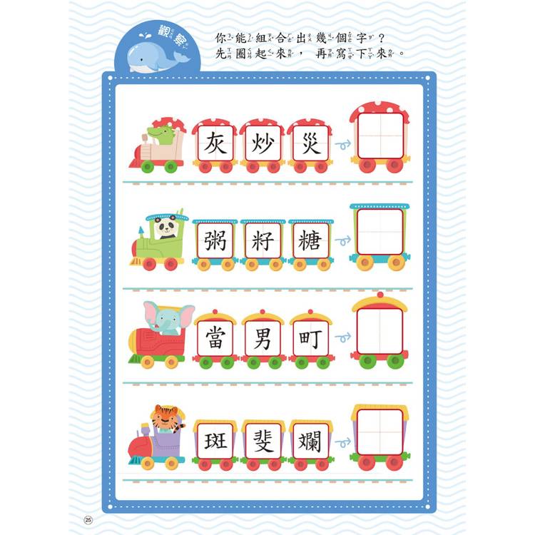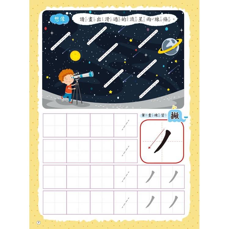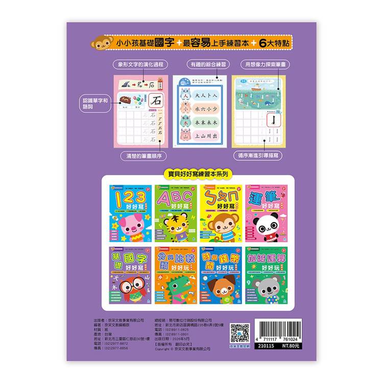 本書特別針對3~7歲幼兒設計,結合描紅臨寫與依據教育部國字標準字體筆順的書寫練習,從基本筆畫、清楚字形到反覆習寫,讓孩子循序漸進寫出正確又漂亮的字。書中融入象形字概念,透過圖像聯想幫助理解字形來源,加深記憶。並搭配遊戲性的綜合練習,在玩樂中自然提升國字辨識能力。