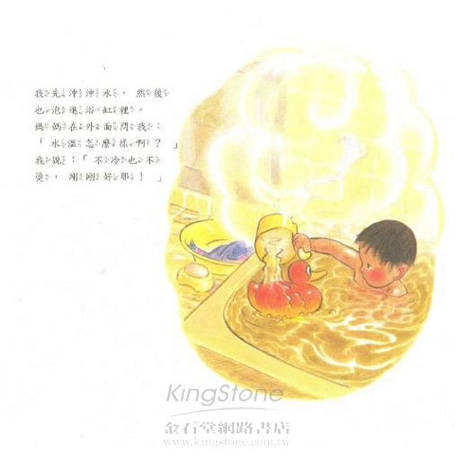 您瞧,從今天起,洗澡再也不是苦差事。哎呀!手腳的皮膚皺得像老公公,泡太久嘍,當心哈啾、哈啾!感冒了。還有,浴室的安全,爸爸媽媽是一刻都輕忽不得的。您可以在腳下加片止滑墊,注意先放冷水再放熱水,教寶貝分辨冷、熱水的開關……