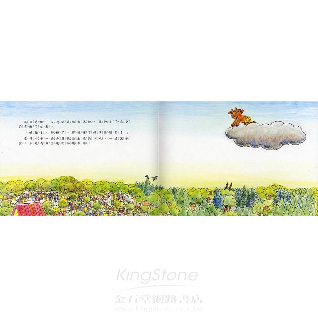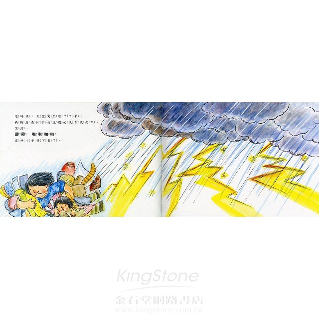 天上的雷神小子不小心被媽媽結得像蜘蛛網的晒衣繩給纏住了。媽媽看到身上髒兮兮的雷神小子,忍不住把他抓起來丟進水裡大洗特洗,連眼睛鼻子都給洗掉了。等雷神小子晒乾了,媽媽請小朋友幫他重新畫臉,咦,雷神小子變得可愛多了,還很帥呢!