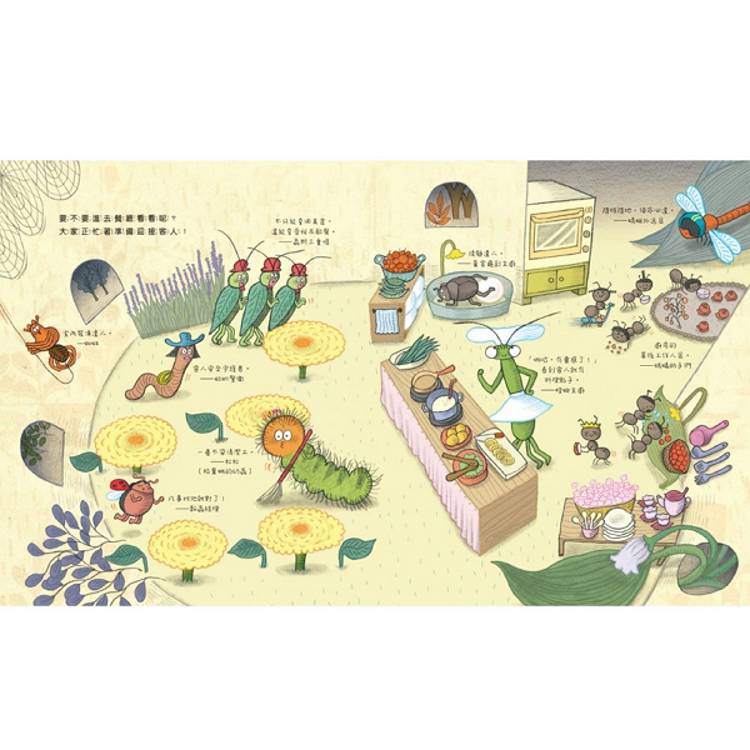 書中創造許多獨特的昆蟲角色,像是用網編織「放屁網」的蜘蛛、使命必達的蜻蜓外送員,以及揉麵技術高超的糞金龜副主廚。這些角色的職責既符合昆蟲的生態特性,又充滿幽默感,讓故事更加有趣。孩子能從角色的設定中學習到昆蟲的特性,而成人也能會心一笑,增添閱讀樂趣,是一本能跨年齡層的優質讀物。