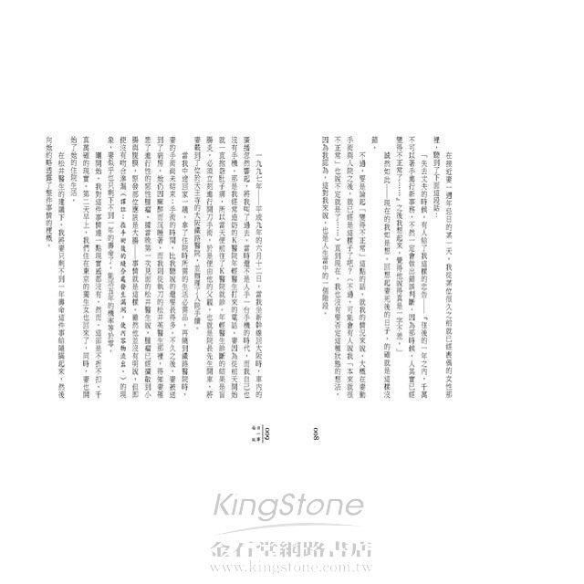 當我中途回家一趟,拿了住院時所需的生活必需品,再繞到鐵路醫院時,妻的手術尚未結束;手術的時間,比我聽說的還要長得多。不久之後,妻被送到了病房,她仍因麻醉而沉睡著,而我則從執刀的松井英醫生那裡,得知妻罹患了進行性的惡性腫瘤。據當晚第一次見面的松井醫生說,腫瘤已經擴散到小腸與腹膜,原發部位應該是大腸——事情就是這樣。雖然他並沒有明說,但即使沒有吻合滲漏(譯註:指手術後的縫合處發生漏洞,使內容物流出)的現象,妻似乎也只剩下不到一年的壽命了,能活五年的機率等於零。