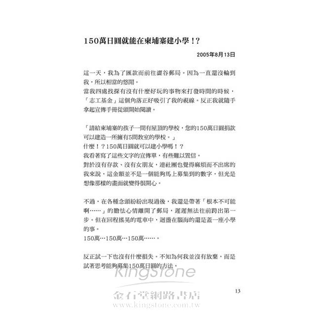 本書以遊記式文章呈現,作者將從得知柬埔寨小學興建計畫開始,一直到前往當地,在當地所發生的、所看到的一切,忠實地透過文字與在當地拍攝的照片呈現在讀者的眼前,讓讀者能夠藉由此書而感同身受。作者在柬埔寨其間經歷了被柬埔寨警察追趕、迎接小朋友活力十足上小學、在愛滋防治醫院的感傷淚水、與被地雷炸斷雙腳裝上義肢的少女一同歡笑……,許許多多的感人事件,讓早已脫離貧困國家的我們,可以瞭解到這世界上確實還有許多事我們所無法改變的,不過如果有心盡一己之力,還是能為許多身在苦難當中的人,帶來希望和歡樂。