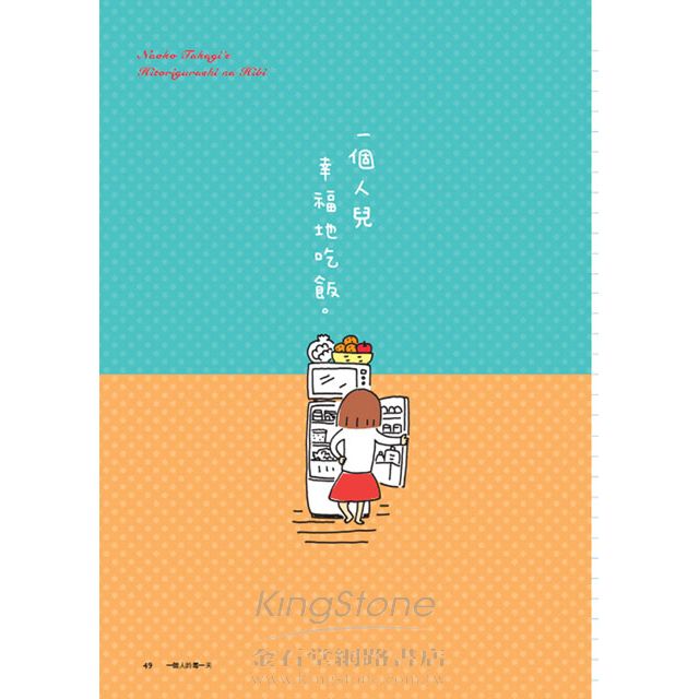 一個人住,高木直子說,很容易陷入低潮,最後懷疑自己的夢想。高木直子說不要怕,當一切都是未知數,也千萬不能放棄自己最初的信念!一個人的每天一天要如何過,看似隨性的高木質子藉著繪圖方式,豐富了看似平淡的生活,期待我們都有屬於滿足自己的每一天.