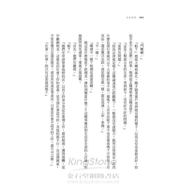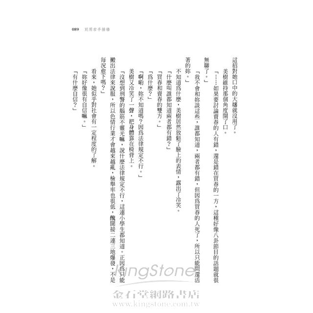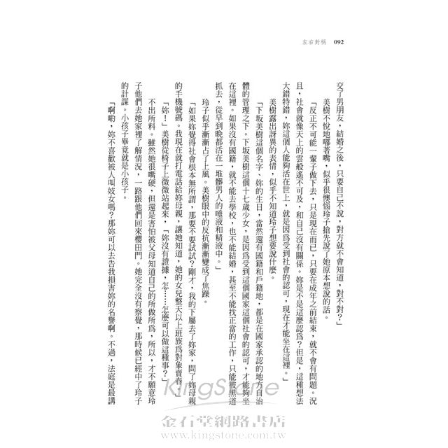 此外,亦透過「案件與人」的關係--加害者、被害者,甚至是被害者友人、離職員警、刑警的另一半等等,從不同的事件關係人覓得看法說法,試圖找出與同類故事不一樣的敘事切入點,為整部作品注入濃烈的情感,淡化了技術性調查細節所帶來的單調感,是本值得細細一讀的警察小說。
