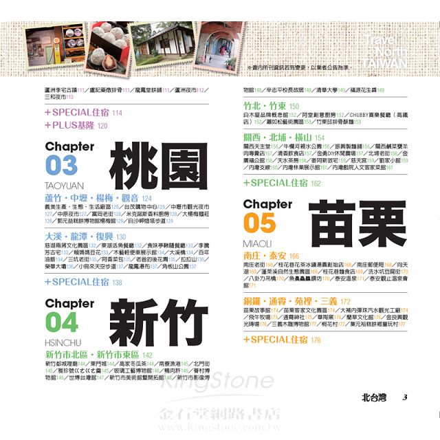 提供讀者大量基隆、台北、桃園、新竹、苗栗5縣市旅遊景點、分區地圖及美食、住宿、交通方式、伴手禮、觀光夜市等情報。
