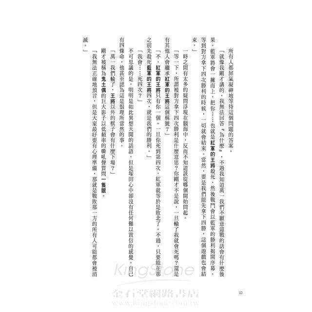 「不,紅軍的王將只有你一個。一旦你死到第四次,紅軍就等於是敗北了。不過,只要能在那之前先殺死藍軍的王將四次,就是我們的勝利。」