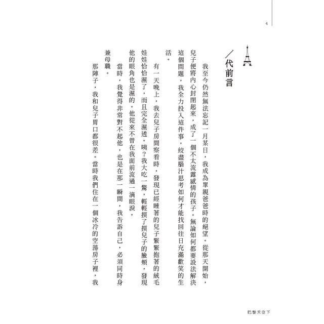 我在兒子剛滿十歲那年離婚,本書從他十四歲左右開始記錄,但有時候也會回想起兒子十歲時的往事。這本書是兒子從小學生到大學期間,我們父子心靈之旅的記實。