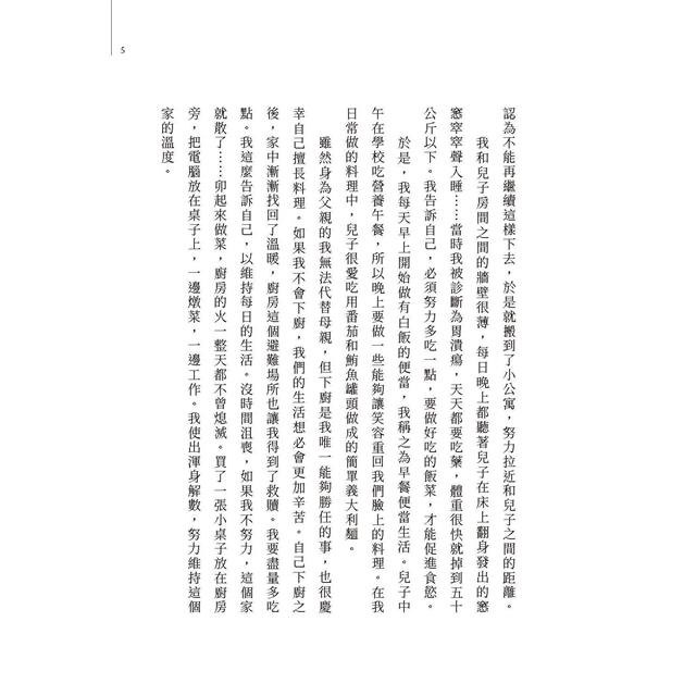 雖然身為父親的我無法代替母親,但下廚是我唯一能夠勝任的事,也很慶幸自己擅長料理。如果我不會下廚,我們的生活想必會更加辛苦。自己下廚之後,家中漸漸找回了溫暖,廚房這個避難場所也讓我得到了救贖。我要盡量多吃點。我這麼告訴自己,以維持每日的生活。沒時間沮喪,如果我不努力,這個家就散了……卯起來做菜,廚房的火一整天都不曾熄滅。買了一張小桌子放在廚房旁,把電腦放在桌子上,一邊燉菜,一邊工作。我使出渾身解數,努力維持這個家的溫度。