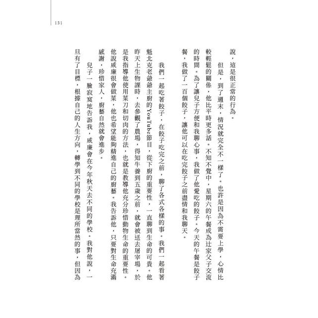 「好吃嗎?」我問兒子,他輕輕點頭回答說:「嗯,好吃。」雖然只是很稀鬆平常的對話,但我認為那是我們父子家庭走向重生的第一句話。