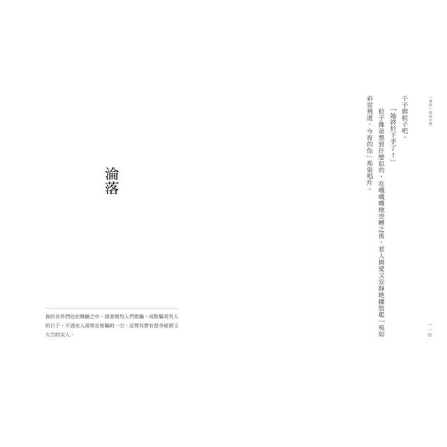 本書中同樣發表於戰後作品的是一九五七年作品〈淪落〉,故事描寫戰後為了活下去每個人每天都拚死命的在尋找食物。而此時卻有一名鄉下小女生卻瞞著家人偷跑去東京,隨性放縱慾望最後不斷向下沉淪而無法自拔。