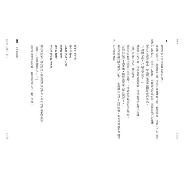 蜜雪兒在入口附近的桌子,十分開心地笑著,跟男子聊天。……男子看來還是學生,穿著稍嫌合身的西裝,不停露出皓齒微笑。他應該是氣質不差的北國男子吧,肌膚蒼白純淨,老鼠灰的襯衫非常適合他。