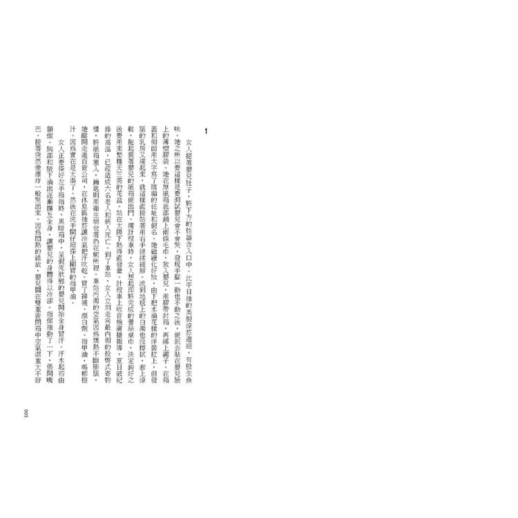女人摁著嬰兒肚子,將下方的性器含入口中。比平日抽的美製涼菸還細,有股生魚味。這麼做是要試試嬰兒會不會哭,發現連手腳都不動,便剝去貼在嬰兒臉上的薄塑膠袋。在厚紙箱底鋪上兩條毛巾,放入嬰兒,用膠帶封箱,再綁上繩子。在箱蓋和側面用大字寫了瞎編的住址和假名。繼續化好妝,由下把水滴花樣的洋裝拉上,但發脹的乳房又痛起來,直接站著就用右手搓揉緩解。流到地毯上的白濁也沒擦拭,套上涼鞋,抱起裝著嬰兒的紙箱便出門。攔計程車時,女人想起即將完成的蕾絲桌巾,決定鉤好之後要用來墊種天竺葵的花盆。站在太陽下熱得直發暈。計程車上收音機廣播報導,夏日破紀錄的高溫,已經造成六名老人和病人死亡。到了車站,女人立刻走向最內側的投幣式寄物櫃,將紙箱塞入,鑰匙則用衛生棉包著扔在廁所裡。離開污濁的空氣因燠熱而不斷膨脹的車站走進百貨公司,在休息區抽菸讓冷氣把汗吹乾。買了褲襪、漂白劑、指甲油,喝柳橙汁。因為實在是太渴了。在洗手間仔細搽上剛買的指甲油。