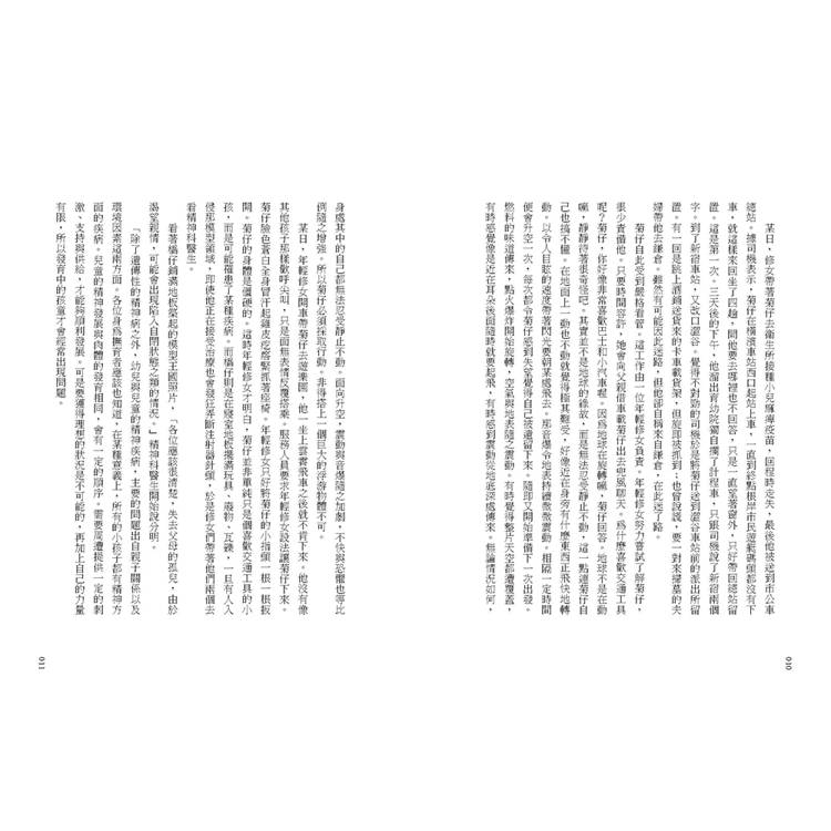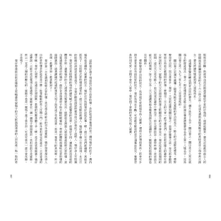 「除了遺傳性的精神病之外,幼兒與兒童的神經疾病,主要的問題出自親子關係以及環境因素這兩方面。各位身為撫育者應該也知道,在某種意義上,所有的小孩子都有精神方面的疾病。與肉體的菊仔自此受到嚴格看管。這工作由一位年輕修女負責。年輕修女努力嘗試了解菊仔,很少責備他。只要時間容許,她會向父親借車載菊仔出去兜風聊天。為什麼喜歡交通工具呢?菊仔,你好像非常喜歡巴士和小汽車喔。因為地球在旋轉嘛,菊仔回答。地球不是在動嘛,靜靜待著很奇怪吧。其實並不是地球的緣故,而是無法忍受靜止不動,這一點連菊仔自己也搞不懂。在地面上一動也不動就覺得極其難受,好像近在身旁有什麼東西正飛快地轉動。以令人目眩的速度帶著閃光要朝某處飛去。那音爆令地表持續微微震動。相隔一定時間便會升空一次,每次都令菊仔嘗到被遺留下來的失望。隨即又開始準備下一次出發。傳來燃料的味道,點火爆炸開始旋轉,空氣與地表隨之震動。有時覺得整片天空都遭覆蓋,有時感覺像是近在耳朵後面隨時就要起飛,有時感到震動從地底深處傳來。無論情況如何,身處其中的自己都無法忍受靜止不動。面向升空,震動與音爆隨之加劇,不快與恐懼也等比例隨之增強。所以菊仔必須採取行動。非得搭上一個巨大的浮游物體不可。