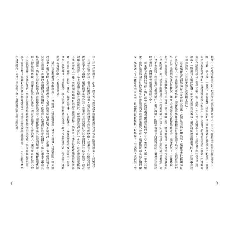 橋仔喜歡帶菊仔參觀模型,一邊解說。這是麵包店,這是瓦斯槽,這是墓園。等到解說結束,菊仔會問:寄物櫃在哪裡?橋仔指著腳踏車的方形尾燈說:那個。黃色塑膠格子裡裝著小燈泡。周圍的金屬擦到毫無鏽斑,藍色和紅色電線仔細捲成圓形。那在領土之中發亮格外顯眼。介紹自己領土時的橋仔變得活潑,菊仔卻會莫名地感到煩躁。橋仔敏感畏縮動不動就哭的時候,菊仔會覺得自己像是一個看著患部X光片的病人。讓仍然隱藏在自己內心的不安與恐懼得以穿上掩飾的外衣。菊仔只要等待那替代自己哭泣的傷痊癒就好。橋仔會睡在模型旁。橋仔會為與菊仔無關的家家酒玩具畏縮哭泣。因為傷已經脫離肉體獨立了。人可以將傷禁閉在自己體內,可是一旦失去了傷,身體就必須去尋找新的傷才行。