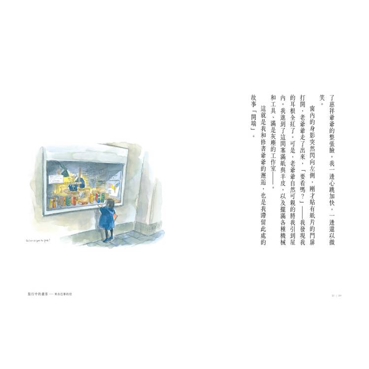 窗內的身影突然閃向左側,剛才貼有紙片的門扉打開,老爺爺走了出來,「要看嗎?」——我發現我的耳根全紅了。可是,老爺爺自然可親的將我引到屋內。我進到了這間塞滿紙與羊皮,以及擺滿各種機械和工具、滿是灰塵的工作室——。