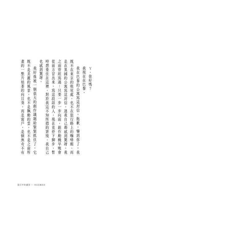 我在巴黎的公寓寫這封信。抱歉,嚇到你了。我既不在東京的租屋處,也不在旅行路上的咖啡館,而是在異國的公寓寫這封信。連我自己都感到驚訝。我之前曾經寫過:只要一步一步向前,創作動機早晚會從前方冒出來。寫這段話的人,現在竟停下腳步,暫時想要住在這裡,對於我這不知所措的窘境,我自己也感到驚訝。
