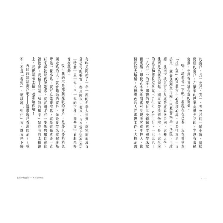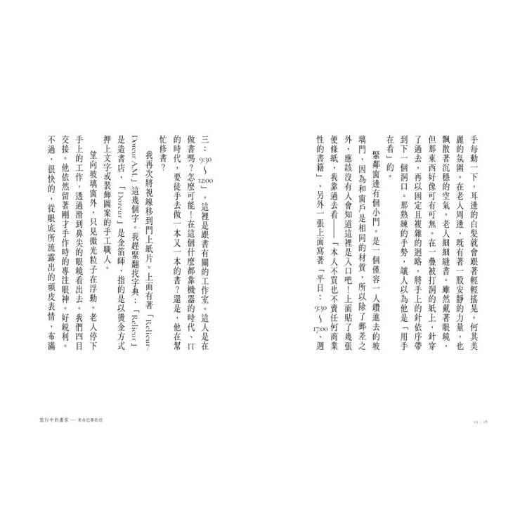 如果你去過巴黎,可以用這本書對照自己的足跡,重溫巴黎街角的氣息;如果你想去巴黎,不妨以此書規劃旅程,尋找那扇藏著古書的窗戶,讓此書帶你走進《書的手藝人》的靈感之地。