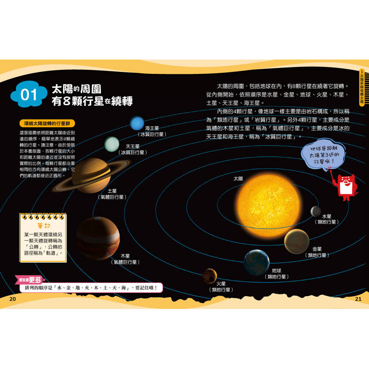 你知道太陽有多大嗎?如果太陽像個直徑100公分的大球,地球只不過是小小的彈珠!《太陽系學校》帶孩子一起展開星際旅行:從炙熱的太陽、與地球相似卻不適合生物生存的水星、金星與火星,到擁有壯觀行星環的土星,以及冰冷遙遠的天王星、海王星。
