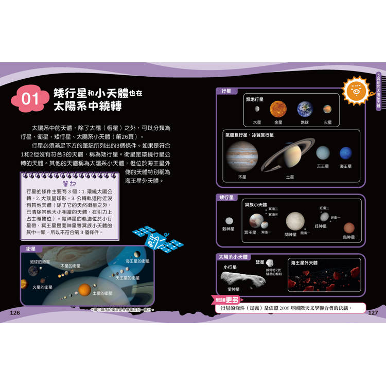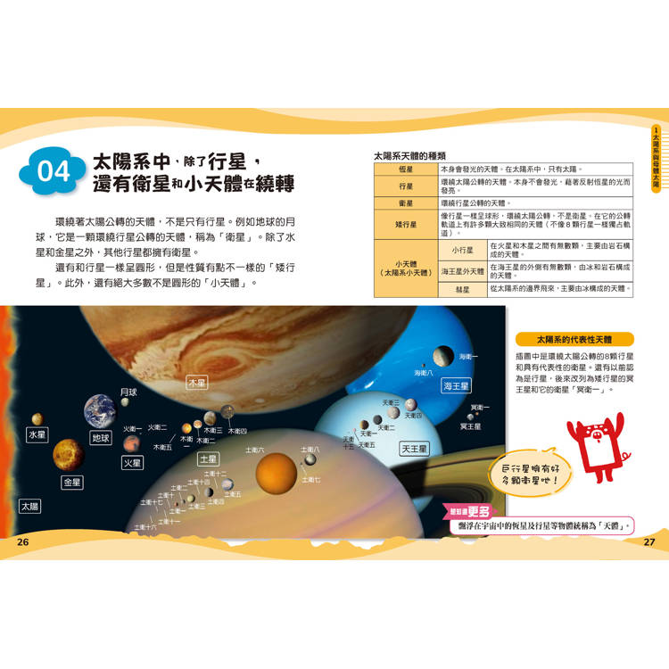 書中還介紹了月球、彗星、流星、矮行星等各式各樣的天體,並帶領孩子思考為什麼唯有地球孕育出生命。透過趣味謎題、豐富插圖和最新天文發現,小朋友能輕鬆建立太陽系的完整概念,也能和家長一同分享宇宙的驚奇!