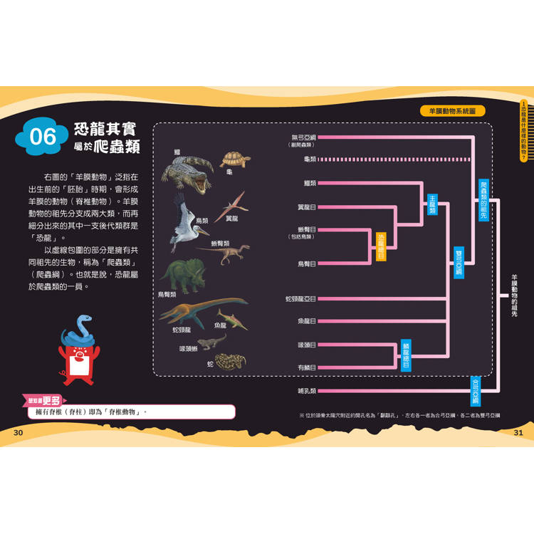 恐龍雖已消失於地球,但化石留下了許多線索。本書以生動插圖與淺顯解說,帶孩子走進恐龍的世界。從恐龍的外型、構造、食性,到大家熟悉的暴龍、三角龍、腕龍等種類,詳列牠們的特徵、生活年代與分布地點。