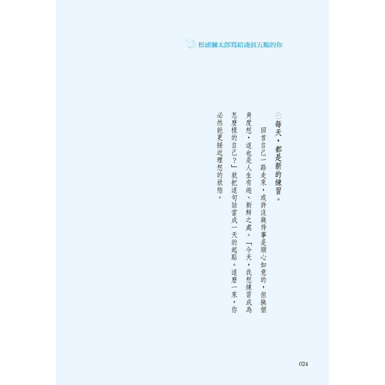 回首自己一路走來,或許沒幾件事是順心如意的,但換個角度想,這也是人生有趣、新鮮之處。「今天,我想練習成為怎麼樣的自己?」就把這句話當成一天的起點。這麼一來,你必然能更接近理想的狀態。