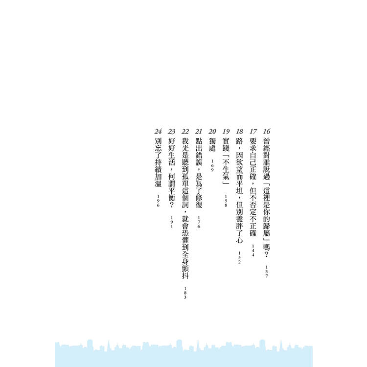 而獨處,正是把自己拾回的過程。無論是一個人看場電影、吃頓飯、讀一本書、流流汗……做什麼都好,唯有暫時隔絕外界的紛擾,你才能讀懂內心的嚮往。進而用適合自己的腳步,繼續前進。