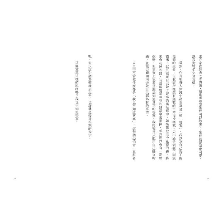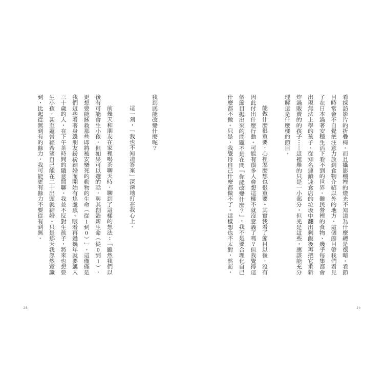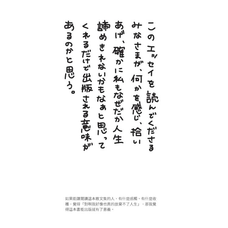 如果閱讀這本散文集的大家能有所感觸,從中獲得些什麼,覺得自己也對人生無法放棄的話,這本書的出版就會很有意義。今後在面對各種辛苦時,若能想到:「人終將會在不知不覺中度過眼前的難關,這些事情會在某一天變成自己沒有放棄的經歷之一」進而讓心情稍微寬慰一下,就太好了。當然,我知道要影響別人的人生觀並沒有那麼簡單,即便如此我很希望能讓某個人心中存在這種慰藉。只有一個人也很好。